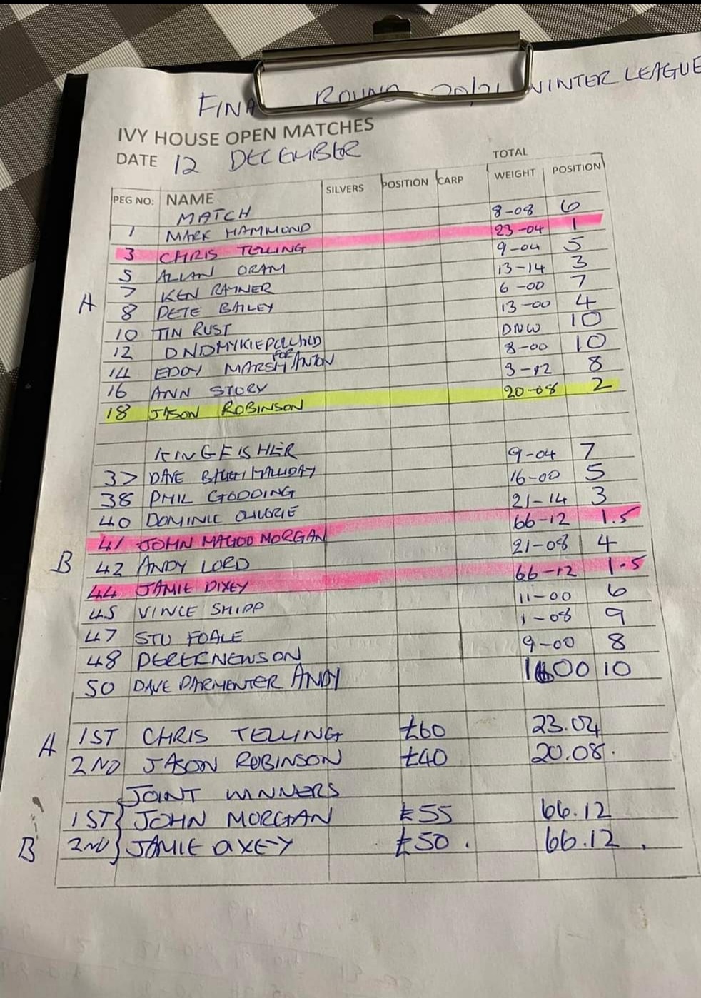 Drew peg 3 on OML (Old Match Lake) and weighed 23lb of silvers, which was a lovely days fishing and lucky enough to win the lake/section. This gave me 8 points which was enough to win the league overall. "Happy days".